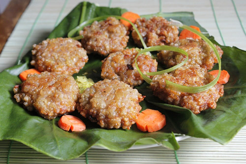 Món ăn cổ truyền của người Hà Nội với vị thơm riêng của cốm làng Vòng quyện với thịt xay, chiên thành từng miếng dẹp vừa thổi vừa ăn với bún đậu mắm tôm thì ngon tuyệt.