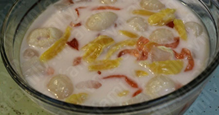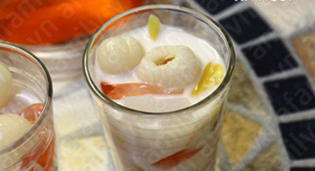 Đổ mít, rau câu, nhãn, vải, thạch dừa vào thố sữa tươi, trộn đều rồi để vào tủ lạnh 3 - 4 tiếng cho mát. |