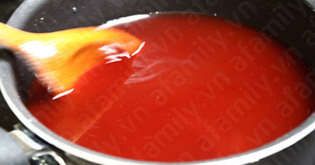 Bắc nồi rau câu lên bếp, vừa đun vừa dùng muôi khuấy đều để rau câu tan hết, thêm vài giọt si rô dâu để rau câu có màu đỏ đẹp. Đun sôi đến khi bột rau và đường tan hết hoàn toàn thì đổ ra bát, đợi nguội cất vào tủ lạnh khoảng 3 - 4 tiếng đồng hồ rau câu đông cứng lại.