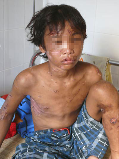 Hào Anh đầy thương tích khi được người dân cứu khỏi trại tôm giống Minh Đức vào tháng 5/2010. Ảnh: TTX. |