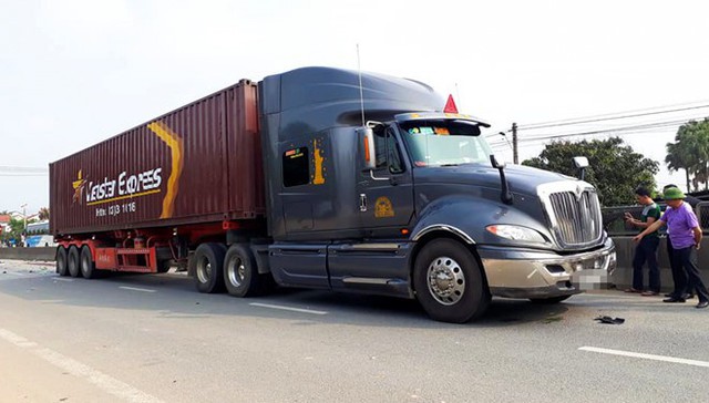 Cú va chạm mạnh khiến ông Chiến ngã xuống đường bị xe đầu kéo cán qua tử vong tại chỗ. Vợ ông bị thương nặng được người dân đưa đi cấp cứu.