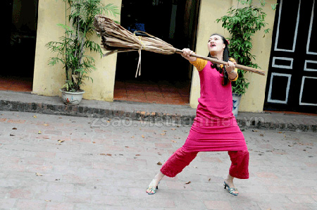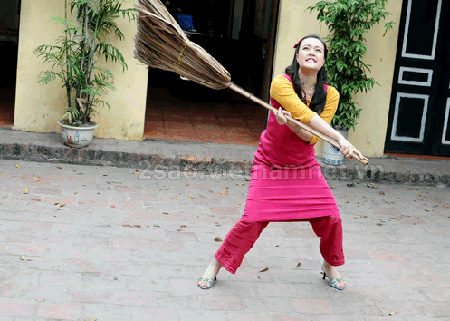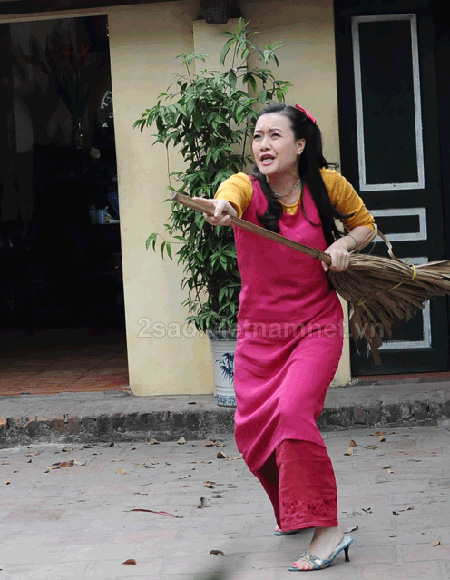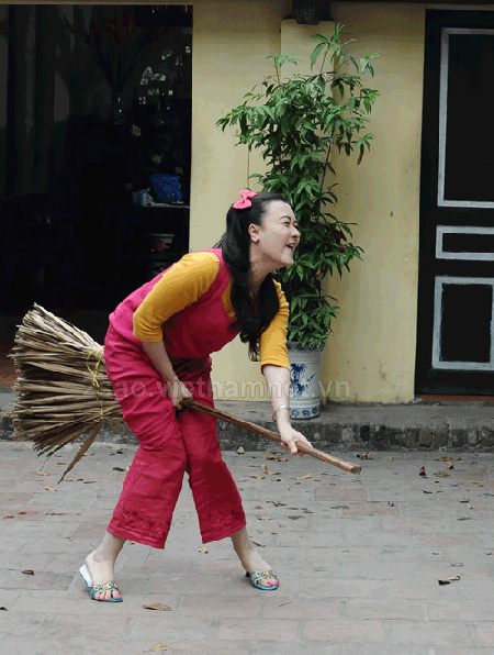 ![]() Vân Dung vừa cầm chổi đứng giữa sân vừa nhẩm lại lời thoại |