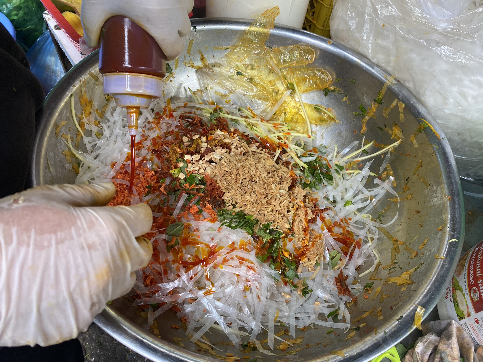 Chị Liên cho biết: “Nguyên liệu rất đơn giản, gồm có bánh đa, hành khô, ngô hạt, tương ớt, rau thơm… Tôi thường sơ chế nguyên liệu từ đêm hôm trước đến sáng dậy có đơn hàng là tôi chuẩn bị cho khách. Do có bà ngoại hỗ trợ nên sự vất vả cũng không đáng kể”.