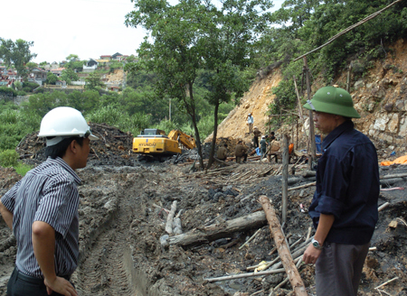 Chủ tịch UBND phường Hà Khánh Nguyễn Tuấn Minh (trái) và lãnh đạo Cty Than Hòn Gai trong một buổi đi "đánh" than tặc. Ảnh: Việt Nguyễn |