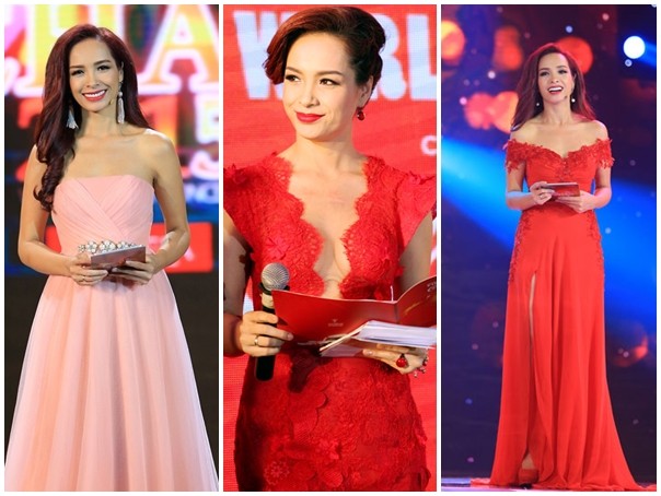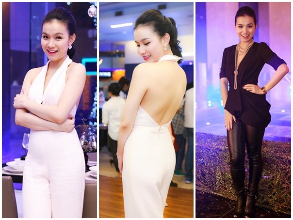 Tại các chương trình, sự kiện, người đẹp sinh năm 1985 phát huy lợi thế vóc dáng trong những bộ đầm ôm dáng, cổ chữ V sâu, trễ nải vai trần...