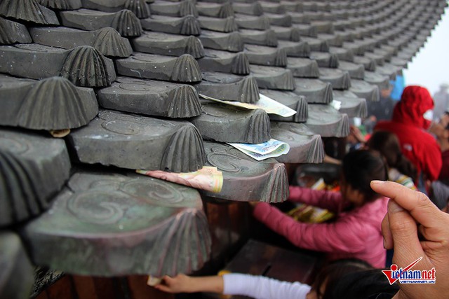 Du khách chen nhau xoa tiền vào tượng Phật, chiêng đồng, thả, dúi tiền lẻ tại các am thờ, khe hở chùa Đồng Yên Tử (Quảng Ninh).