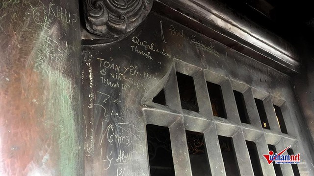 Ngoài những hành động nhét tiền lẻ, xoa tiền, ở chùa Đồng nhiều năm nay còn xuất hiện chi chít những vết khắc xấu xí do các du khách để lại.
