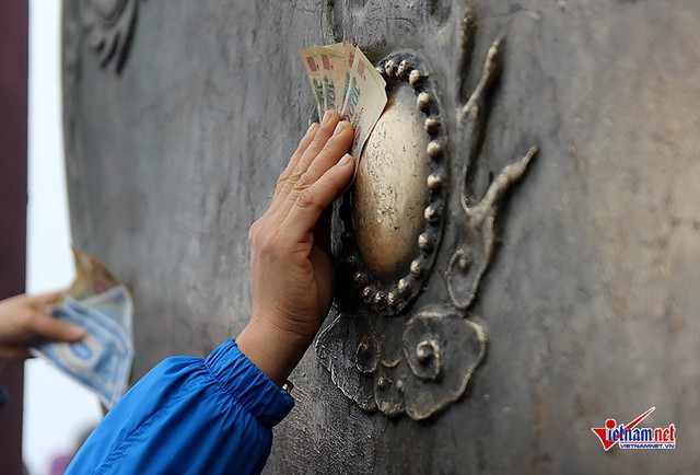 Anh Tú (quê Hà Nam) chia sẻ: "Khai hội xuân Yên Tử, cũng là ngày thần tài nên tôi xoa tiền 500 nghìn vào chiêng đồng với hi vọng mang lại nhiều tài lộc cho năm mới".