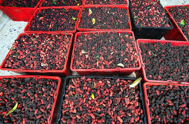 Chị Thủy làm nghề thu mua dâu lâu năm ở xã Hiệp Thuận. Mỗi ngày chị thu mua được khoảng 600 kg và dựa vào chất lượng quả dâu để định giá. Những quả dâu to, dài, đẹp mã và mọng nước sẽ có giá 15.000 đồng mỗi kg, quả bé và khô thì giá 10.000 đồng mỗi kg.