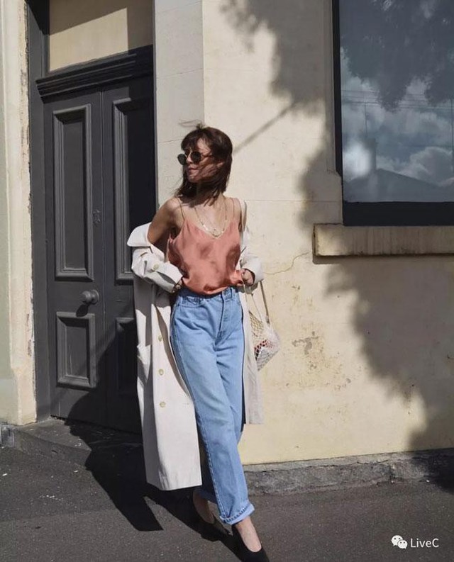 Nếu không thích "công sở" set đồ đầu tiên, bạn có thể thay bằng áo dây màu pastel và quần jean nhạt màu cho buổi dạo phố. Hãy nhớ giày cao gót sẽ là "vũ khí" giúp bạn dù xách túi lưới mà trông vẫn sang nhé.