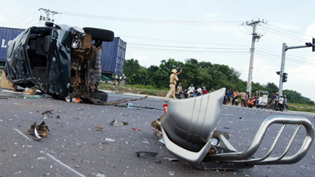 Theo thông tin ban đầu, ôtô biển đỏ 7 chỗ ngồi hiệu Mitsubishi chạy đến giao lộ Huỳnh Văn Lũy- Nguyễn Văn Linh (thị xã Thủ Dầu Một, Bình Dương) thì va chạm với ôtô Ford Transit 15 chỗ chạy cắt ngang mặt.