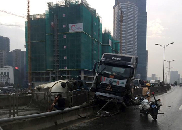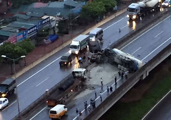 Xe bồn mất lái đâm vào dải phân cách rồi lật ngang đường sau va chạm với xe đầu kéo lưu thông cùng chiều trên đường vành đai 3 (ở Hà Nội), giao thông ùn ứ nghiêm trọng.