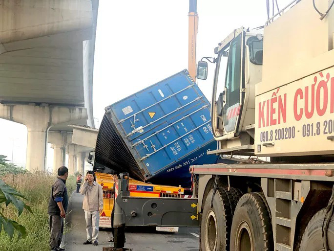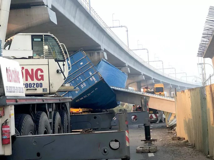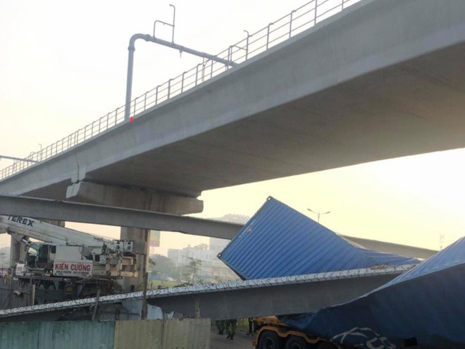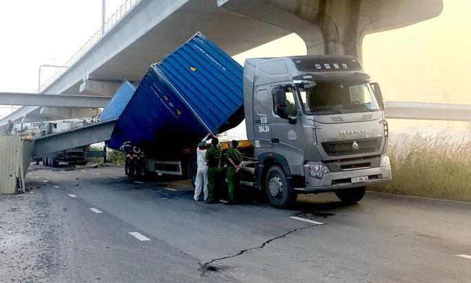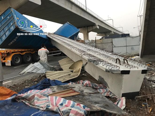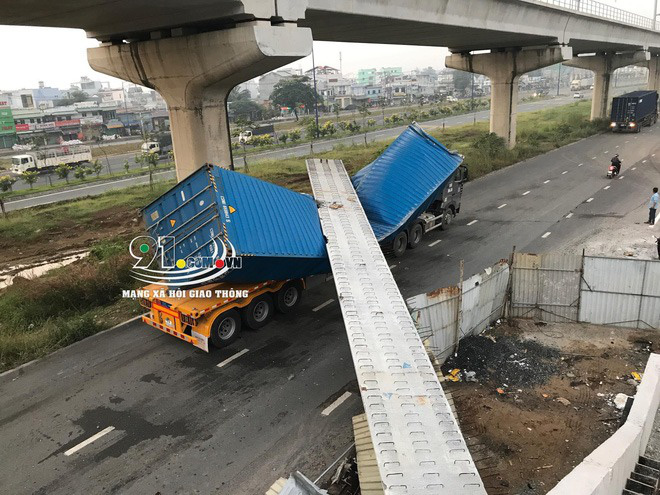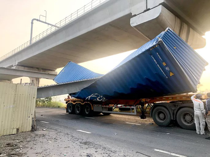 Pha va chạm mạnh này đã khiến dầm bê tông rơi xuống, đè bẹp thùng xe container. May mắn là vụ việc không gây ra thương vong gì. Giao thông khu vực này rơi vào tình trạng ùn tắc kéo dài.