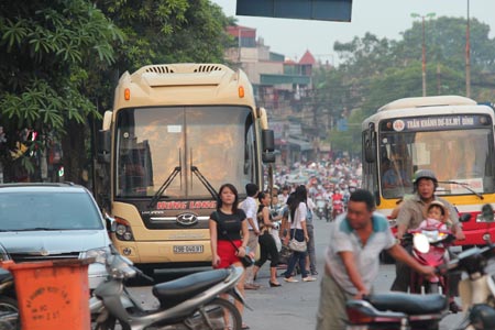 Xe của công ty Hưng Long dừng, đỗ, đón trả khách trên phố cấm và chiếm luôn điểm dừng xe buýt (phố Trần Khát Chân). Ảnh: M. A |