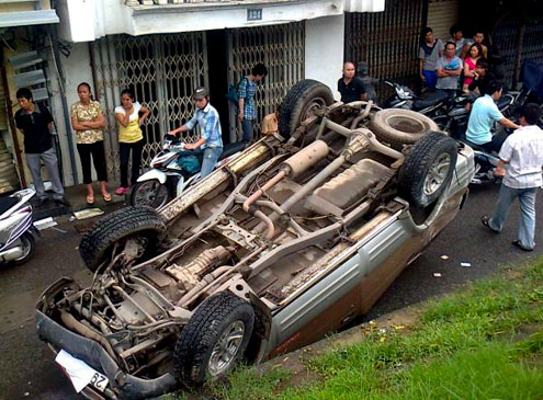5 giờ sáng nay, xe Isuzu 7 chỗ do nam tài xế điều khiển chạy theo hướng Âu Cơ - Nghi Tàm (quận Tây Hồ, Hà Nội), đột ngột mất lái lao sang bên đường, đâm đổ bốt điện, tông vào cửa nhà 128, 126 và lật chổng vó dưới chân đê.