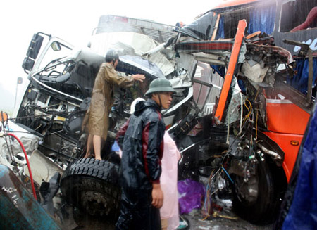 Cú đâm khiến đầu 3 xe bẹp dúm 2 tài xế chết tại chỗ, 9 người trọng thương.