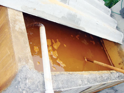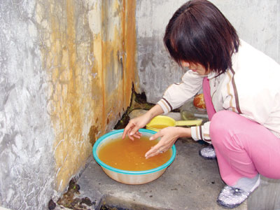 Với bộ mặt rầu rĩ, Nguyễn Thị Tú Oanh – sinh viên ĐH KHXH & NV kể: “Chủ nhà thì lúc nào cũng bảo với bọn em đây là nước máy nhưng khi leo lên bể thì hàng lớp cặn vàng dày cộm bám hai bên thành bể. Hàng ngày, muốn đánh răng rửa mặt cho kịp giờ học buổi sáng là phải “xử lý” nước từ tối nếu không thì phải chờ ít nhất 20 phút, nước mới lắng cặn. Còn nước dùng để nấu ăn thì phải mua nước tinh khiết chứ không thể dùng nước ở đây được. Bạn em trước đến ở chưa đầy một tháng đã nổi mẩn ngứa khắp người vì dị ứng với nguồn nước khiến bạn ấy phải điều trị cả tháng trời mới khỏi”.
