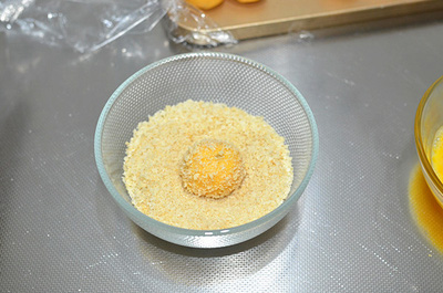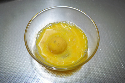 Đánh tan trứng trong một chiếc bát, lăn từng viên bánh qua trứng.