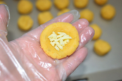 Ấn dẹt viên bột và cho một ít phô mai bào vào giữa.