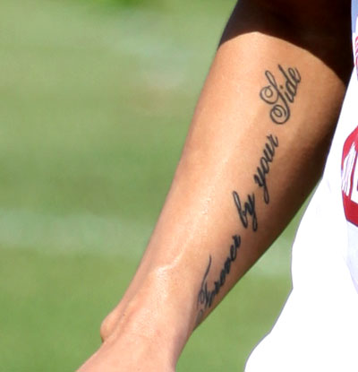 Trên tay của tiền đạo 25 tuổi mới có thêm một dòng chữ tiếng Anh "Forever by your side".